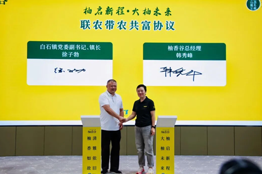 仪式现场,播放了武胜县县委书记陈俊楠、酉阳土家族苗族自治县县委书记杨通胜发来的贺电,并宣读了百色市人民政府发来的贺信。在与会领导和嘉宾的见证下,柚香谷与常山县政府签订了旅游度假区建设战略协议,还特别与白石镇签署《联农带农共富协议》,通过“企业+合作社+农户”模式,有效整合土地、劳动力与产业链资源,助力村级集体经济壮大和农民收入提升。