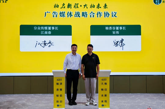 分众传媒董事长江南春与柚香谷董事长宋伟在仪式活动上共同签署广告媒体战略合作协议,合作金额2亿元人民币,标志着双方将在品牌建设、市场推广等方面展开深度合作。