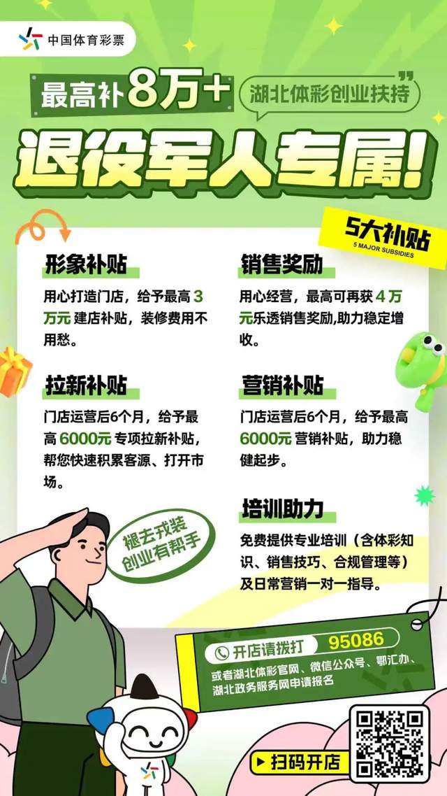 湖北体彩通过实实在在的政策支持,帮助退役军人实现从军营到社会的平稳过渡,拓宽就业创业渠道。有意向开店的退役军人可拨打咨询电话95086,或通过湖北体彩官网、微信公众号、“鄂汇办”APP、湖北政务服务网等渠道报名申请。
