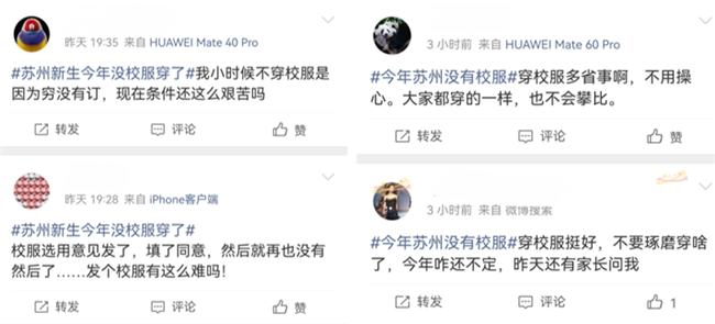 据悉,今年秋季开学后,全国多地因校服购置专项整治延续,出现校服采购停滞现象。校服迟迟无法到位,不仅让家长担忧孩子校园活动的着装统一与安全识别问题,也给学校日常管理带来不便,相关舆情持续发酵。此前,“今年苏州没有校服”话题一度登顶同城热搜榜首位,千万流量背后满是家长的焦虑与吐槽:“我小时候不穿校服是因为穷没有订,现在条件还这么艰苦吗?”“穿校服多省事啊,不用操心。大家都穿得一样,也不会攀比。”