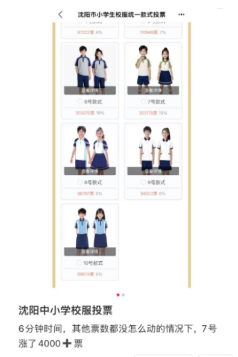投票活动开始后,有网友曾在社交平台发文质疑票数出现异常,部分候选校服出现在短时间内票数骤增的情况。“沈阳校服投票引争议”相关话题也一度登上社交平台热搜。