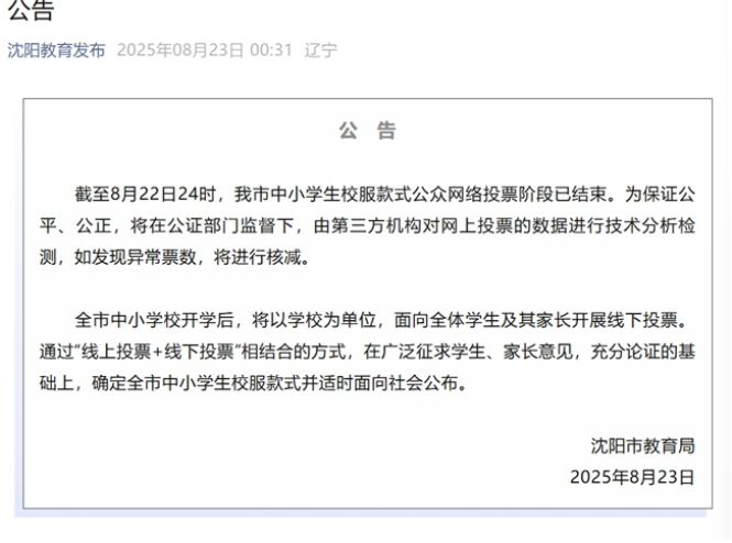 面对汹涌舆情,沈阳市教育局于8月23日紧急发布公告,称截至8月22日24时,市中小学生校服款式公众网络投票阶段已结束。为保证公平、公正,将在公证部门监督下,由第三方机构对网上投票的数据进行技术分析检测,如发现异常票数,将进行核减。