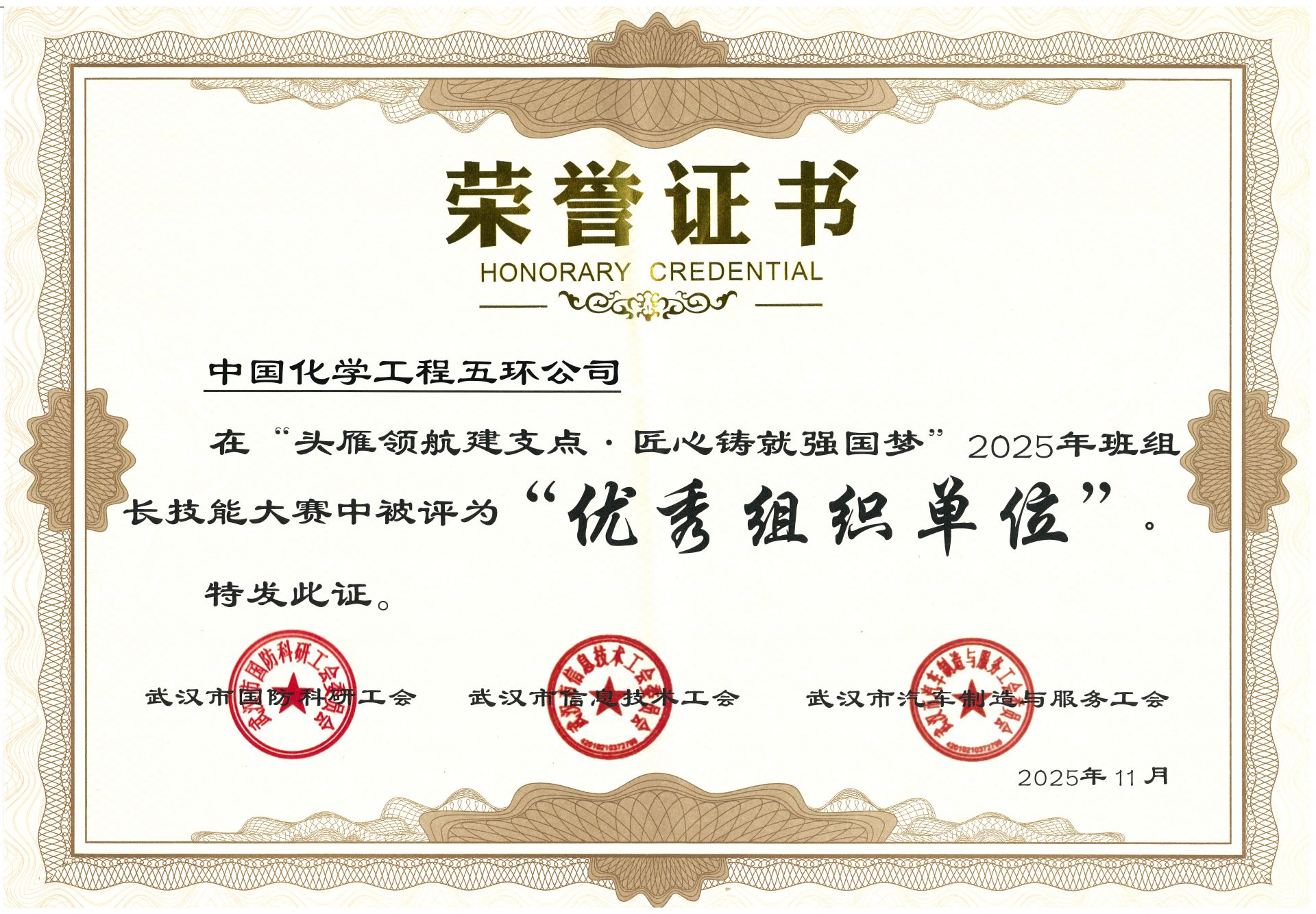 本次大赛,中国化学工程所属中国五环工程有限公司喜获双丰收:公司被评为“优秀组织单位”,公司技术开发研究院甲烷化班班组长孔令凯荣获班组长技能大赛一等奖。