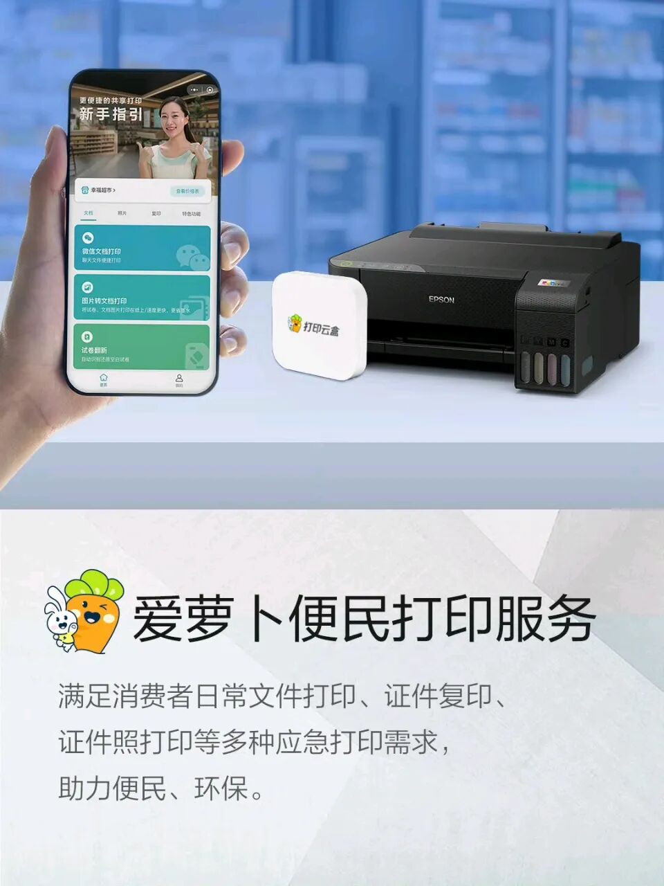 如面对中国共享经济的发展,爱普生推出了“爱萝卜便民打印”服务。据石桥响介介绍,该服务专门面向那些没有打印机购买需求,但又偶尔需要紧急打印的用户。“爱萝卜便民打印”在便利店、文具店、大型连锁门店、互联网闪电仓等地,提供覆盖用户社区的便捷解决方案。用户可以在家门口或附近通过手机轻松完成打印,满足微量的打印需求。