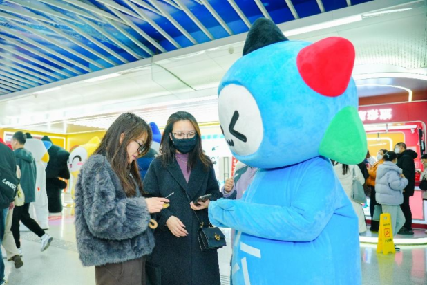 “这个吉祥物太可爱了!”一位通勤乘客一边拍照一边说道,拿出手机记录这一可爱瞬间。萌态十足的乐小星出现,便迅速成为站内焦点。不少乘客纷纷放慢脚步,乐小星们也十分配合,不时摆出挥手、比心等互动姿势,主动与乘客合影留念,而到了送票环节,人群更是一窝蜂地涌来,原本匆忙的地铁空间充满了温馨与欢乐。