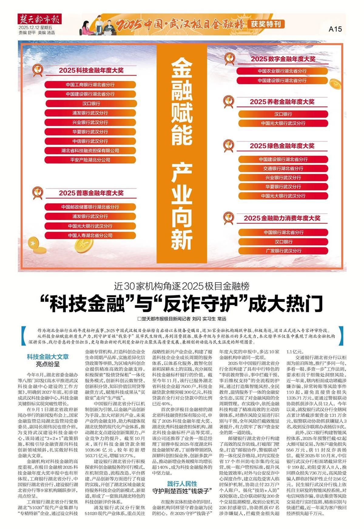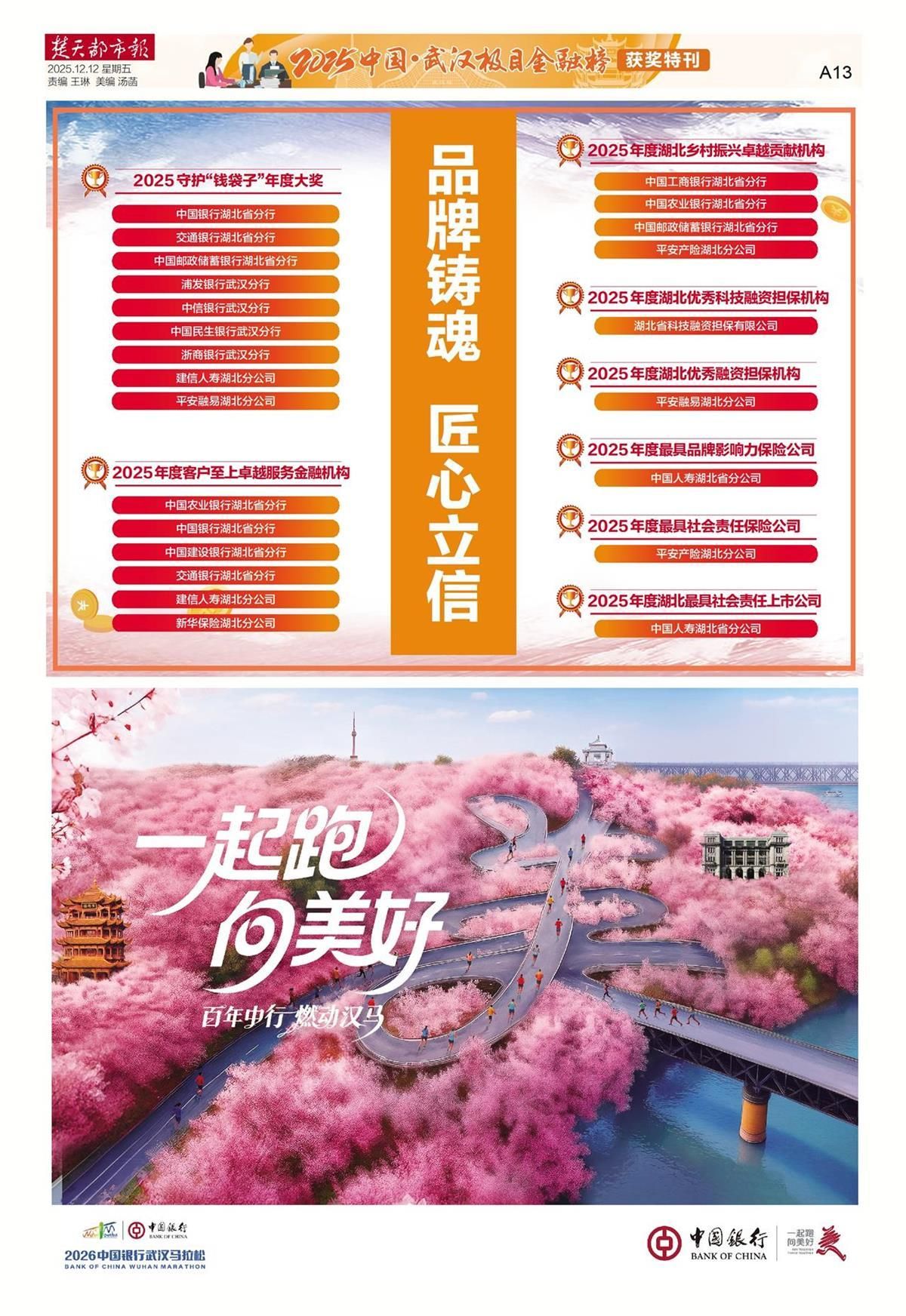 12月12日,2025中国·武汉极目金融榜榜单揭晓,平安产险湖北分公司凭借在科技创新、乡村振兴、社会责任等方面的突出表现,荣获“2025科技金融年度大奖”“2025年度湖北乡村振兴卓越贡献机构”“2025年度最具社会责任保险公司”三项大奖,彰显其在服务民生与赋能行业发展方面的卓越贡献。
