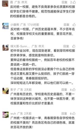 家长与学生的反馈也印证了这一担忧。在社交媒体平台上,“反对统一校服”的声音占据主流,不少网友表示:“广州百年名校众多,执信、广雅、真光等校的校服是文化传承,更是学生的荣光”“深圳与广州教育格局不同,何必照搬”,还有家长担忧统一后可能出现劣质面料、监管缺位等问题。