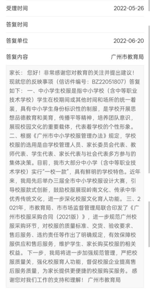 广州市教育局坚持“一校一款”并非主观决断,而是基于扎实调研的理性选择。在2024年7月对政协提案的答复函中,市教育局明确“暂不推行全市统一校服,优化‘一校一款’模式”,这一结论背后是覆盖22万学生及家长的问卷调研支撑。