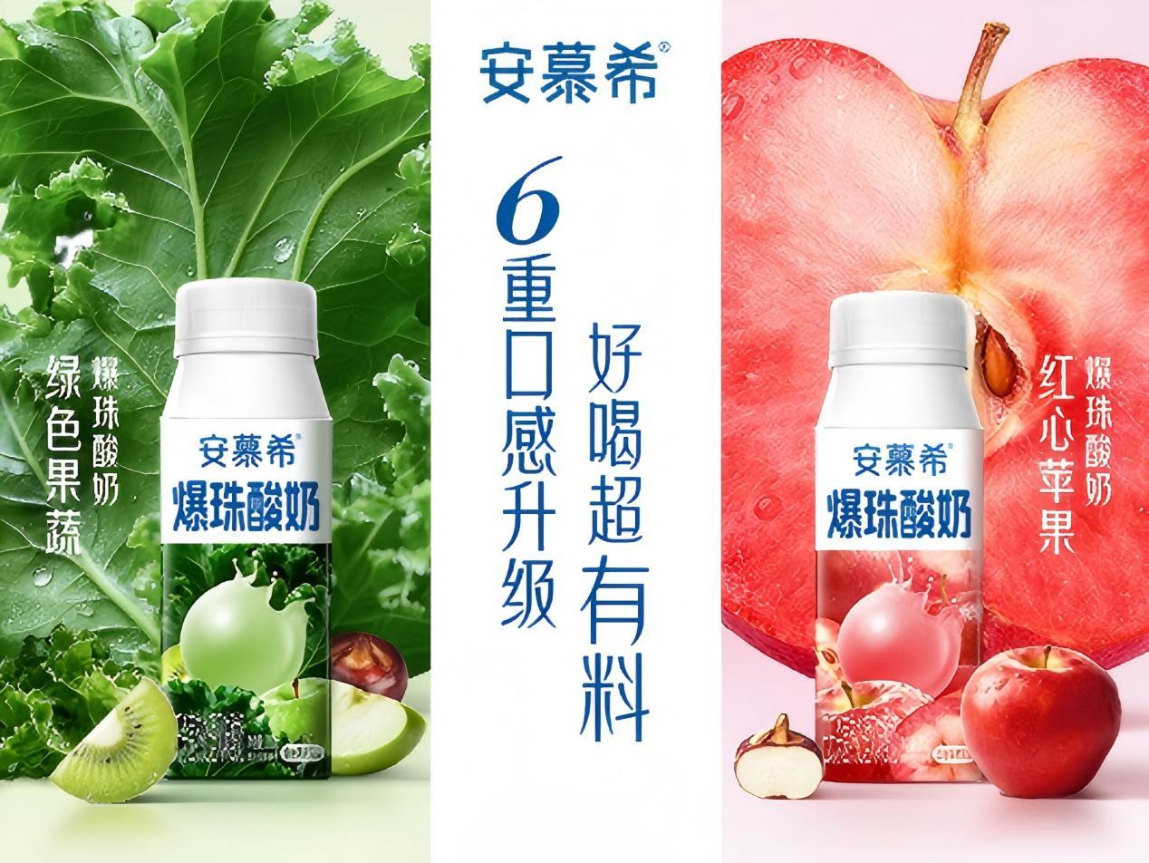 “好喝到爆”的安慕希爆珠酸奶全新升级,推出红心苹果味和绿色果蔬味两款新品,融合鲜果颗粒、超级食材与BC99益生菌,带来6重口感体验。