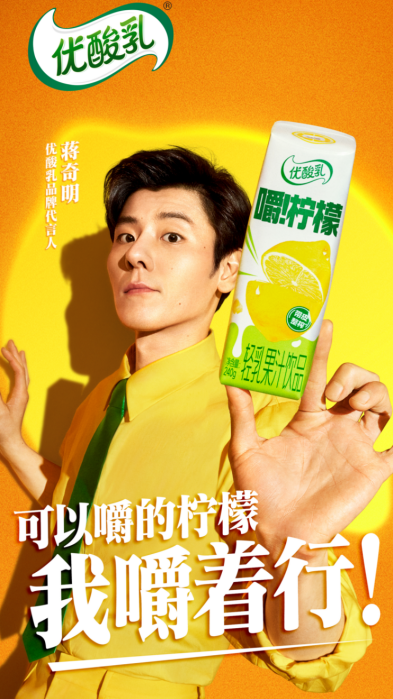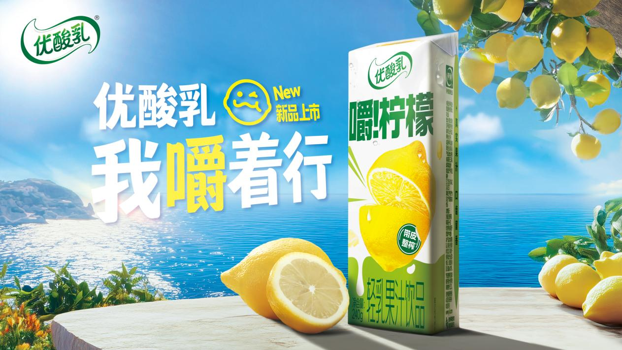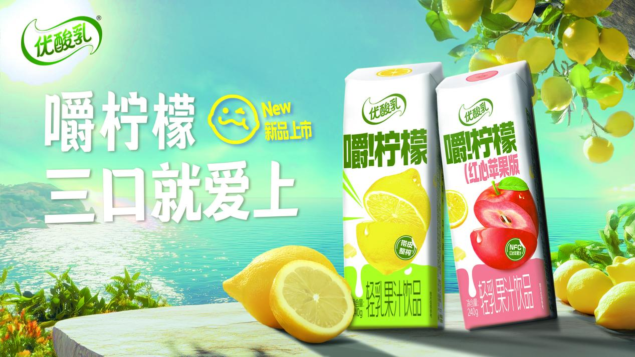 优酸乳拓展轻乳果汁饮品品类矩阵,推出嚼柠檬红心苹果味新品,通过稀缺果种与柠檬的搭配,升级NFC果汁,首创四重颗粒口感,更好满足Z世代对咀嚼感的偏好。