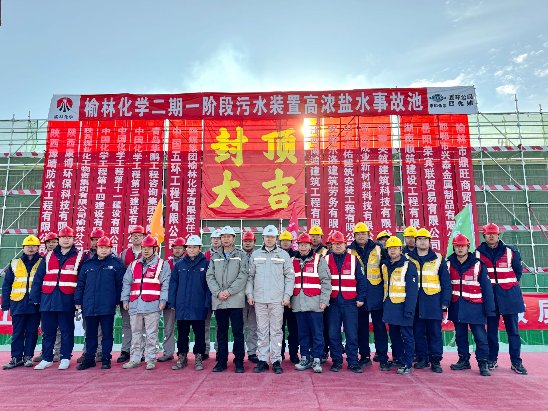 荆楚网(湖北日报网)讯(通讯员 张邦兴、陈翔宇)12月30日,由中国化学工程所属中国五环工程有限公司总承包建设的榆林化学二期一阶段项目污水处理装置高盐废水事故池顺利封顶,为后续工程推进奠定坚实基础。榆林化学党委副书记、董事、总经理段立波,榆林化学副总经理王为锋,公司党委副书记、总经理宁建平,四化建党委委员、副总经理、安全总监张日晖出席封顶仪式。