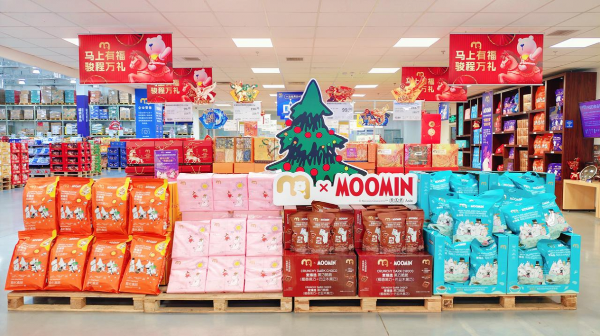 在“商务赠礼”场景,重点打造了文化赋能系列。如“祥瑞山海经”高端礼盒,融合了干海产、菌菇、南北干货,包装设计以麒麟、天马等神兽为纹饰,寓意吉祥,彰显赠礼格调。另有多款与姆明联名的休闲商品,源自芬兰的治愈系IP,表达了企业对员工的温暖关怀。