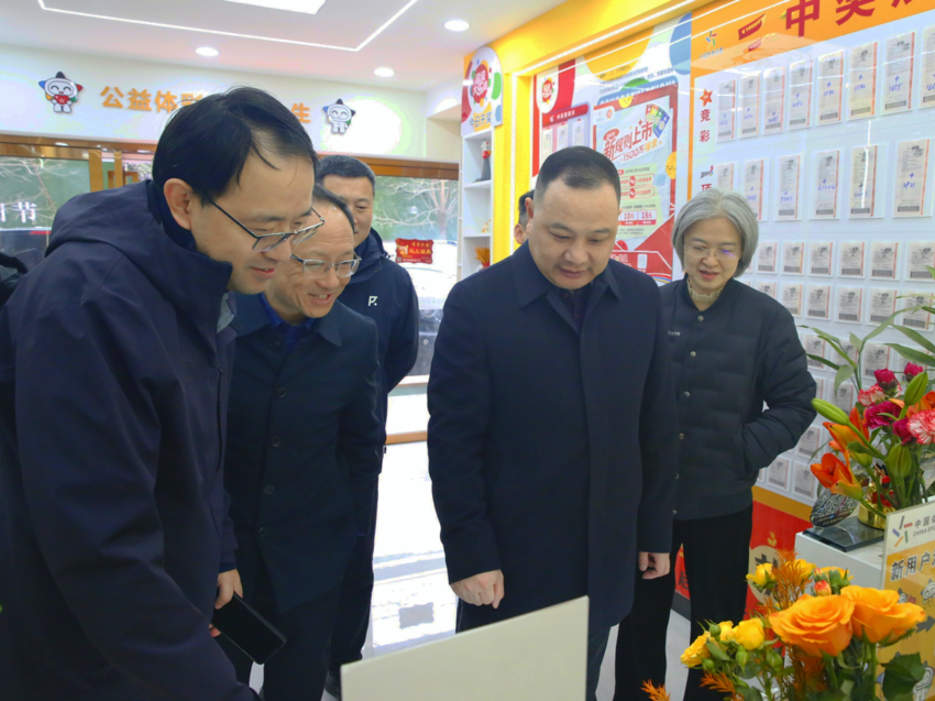 随后,余平辉一行来到江大路02321体彩代销点,看到整洁爽目的店容店貌,他连声夸赞。这是一家经营近10年的体彩老店,代销者张云义更是一名“销售能手”。走进店内,电子展示屏上实时滚动赛事数据,AI分析系统为购彩者提供专业参考,墙上的奖牌记录着这家店的荣誉佳绩。余平辉鼓励代销者继续发挥特长,把老店的金字招牌擦得更亮,同时与店内购彩者交流,询问购彩者们对体彩服务的建议和意见。