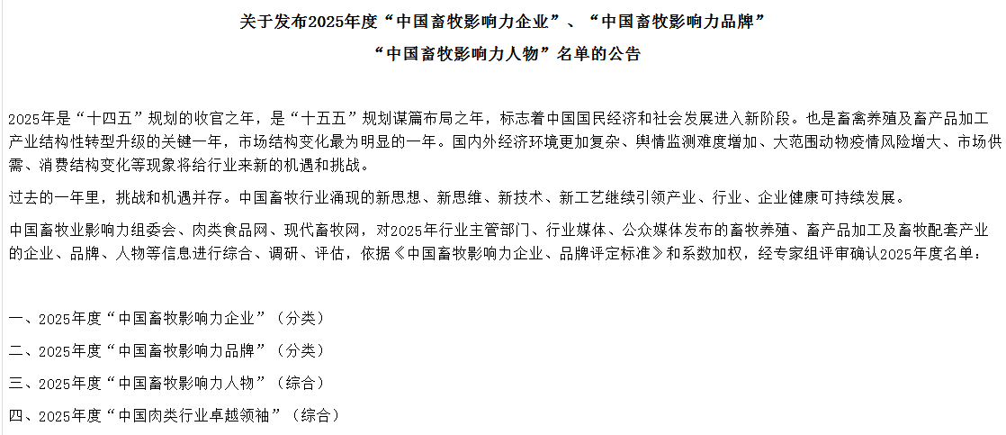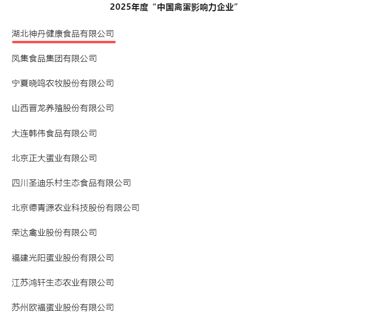 荆楚网(湖北日报网)讯(通讯员 刘梦)近日,经中国畜牧业影响力组委会联合肉类食品网、现代畜牧网等权威机构联合评定,湖北神丹健康食品有限公司凭借全产业链领先布局、蛋禽育种核心优势、蛋品科技持续创新及全球化市场稳健拓展,成功斩获2025年度中国禽蛋最具影响力企业第一名。