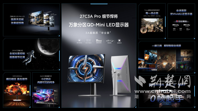 “细节悍将”C3A Pro针对追求极致观影与3A游戏画质的用户,凭借万象分区QD-Mini LED技术成为3A大作的“版本毕业答案”。该系列拥有2304个万象分区、XDR 2200尼特亮度和QLED绚彩量子点技术,完美还原游戏开发者打造的精良画面,带来最真实的光影、最完整的细节和最还原的色彩。其独特的全域光晕控制技术通过“聚核光芯”“超聚光微透镜”和紧凑混光结构,搭配TCL华星顶级的HFS Shoot屏技术,并在TCL自研控光算法的加持下,实现了“一区顶多区”的极致控光效果,带来了传统显示器完全无法企及的画面通透感与立体感。而XDR 2200尼特亮度不仅能让亮部效果层次分明,还能精细呈现暗部细节,避免暗部死黑。QLED绚彩量子点技术使DCI-P3色域覆盖达到99%,色彩鲜艳且精准。