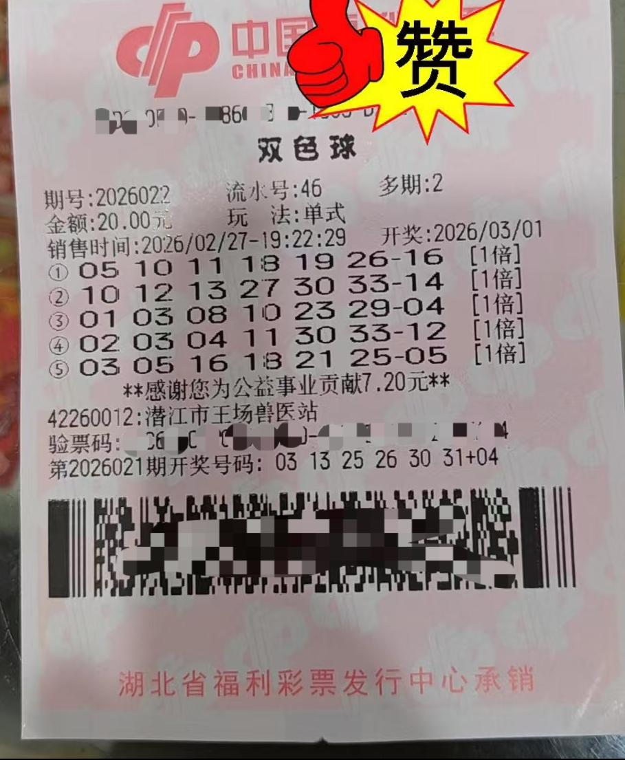 小胡说,几日前,他邀约两位同事,前往辖区内的福彩投注站购彩。三人先是刮了5张刮刮乐,准备离场时,意外发现该站点支持多期彩票购买这一服务。出于对“新生事物”的好奇,小胡当即机选了5注双色球单式票,并选择投注2期,涵盖3月1日开奖的2026021期与3月3日开奖的2026022期。购彩结束后,小胡随手将彩票收起,离开了站点。