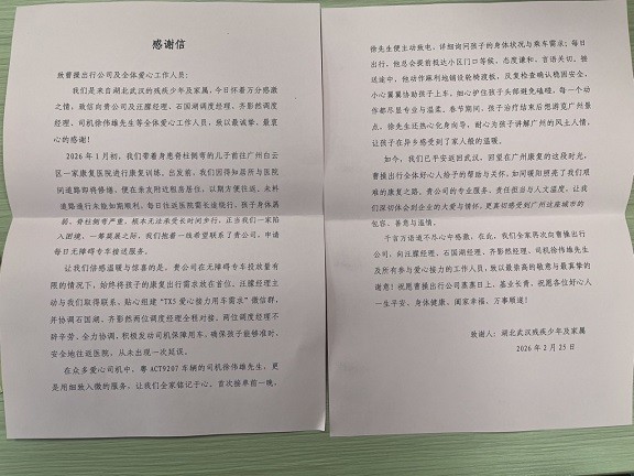 “我们是来自湖北武汉的残疾少年及家属,今日怀着万分感激之情,致信向贵公司及全体爱心工作人员致以最诚挚、最衷心的感谢!”近日,一封跨越千里的感谢信寄抵曹操出行广州分公司。落款处,是不久前结束广州异地就医之行的一家人。信中所致谢的,是春节前夕,一群曹操出行无障碍专车司机为一名脊柱侧弯少年接力铺就的“爱心就医路”。