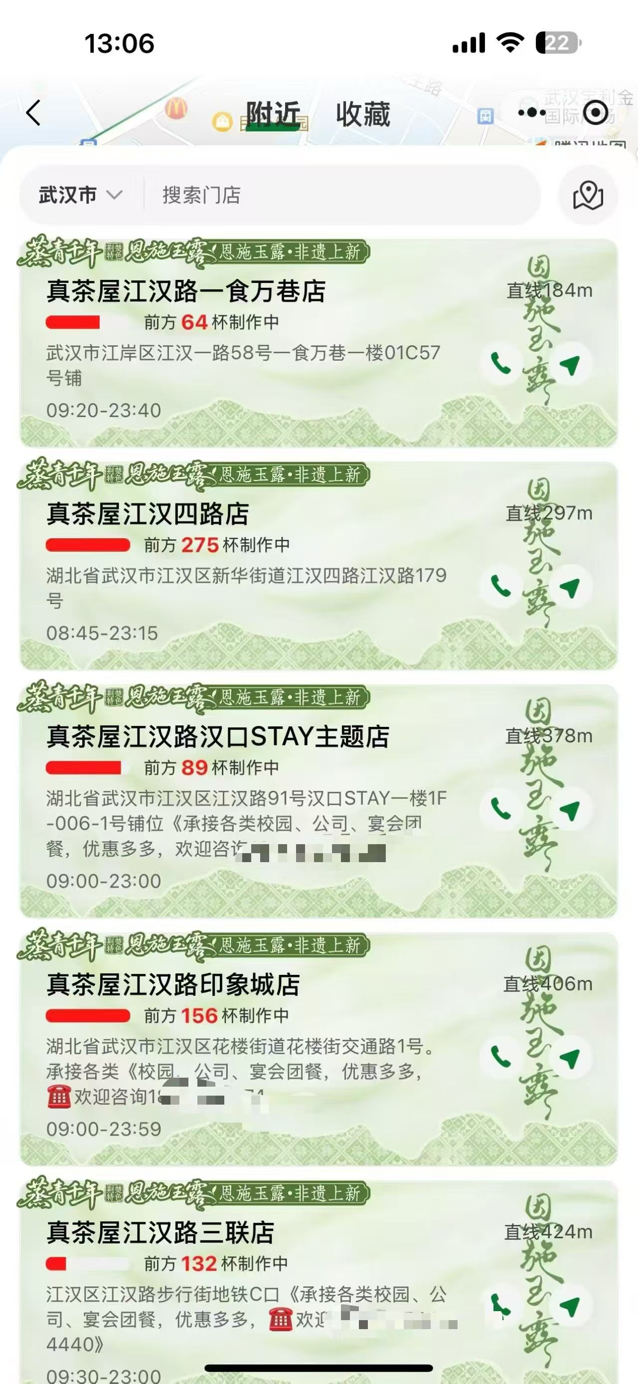 从记者实拍的门店数据来看,真茶屋江汉四路店前方 275 杯制作中,江汉路印象城店、三联店也分别有 156 杯、132 杯的待做订单,虎泉店、万松园店同样保持着 70 杯以上的高排队量。即便是非高峰时段,湖北大学店、中南财大小吃街店等高校周边门店,也有 30 杯左右的订单在排队,几乎覆盖了武汉全区域的核心客流。