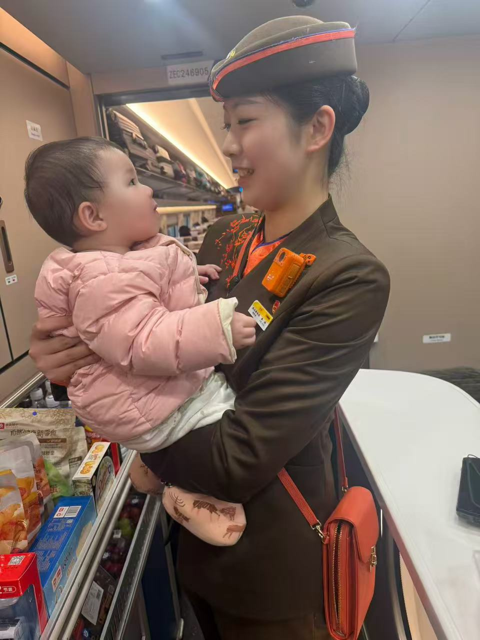 荆楚网(湖北日报网)讯(通讯员 余梦青)2026年4月12日,G393次列车武汉站始发后,列车员李洪在巡视完车厢后发现一名宝妈带着小孩,此时列车员李洪便向前询问,经了解,这名宝妈独自带着小朋友回家,坐车途中无人照看小朋友,并表示自己想去趟卫生间,希望列车员能帮忙照料,列车员李洪热情的答应了这位宝妈的要求。列车行驶途中,年幼的小宝宝在车厢里格外乖巧可爱,列车员温柔俯身,轻轻将孩子抱在怀中。眉毛弯弯、笑意温柔,耐心安抚陪伴着小小旅客,稚嫩的孩童仰头望着暖心姐姐,满眼依赖与欢喜。一抱一笑之间,冰冷的旅途化作浓浓温情,狭小车厢里满是治愈与善意。