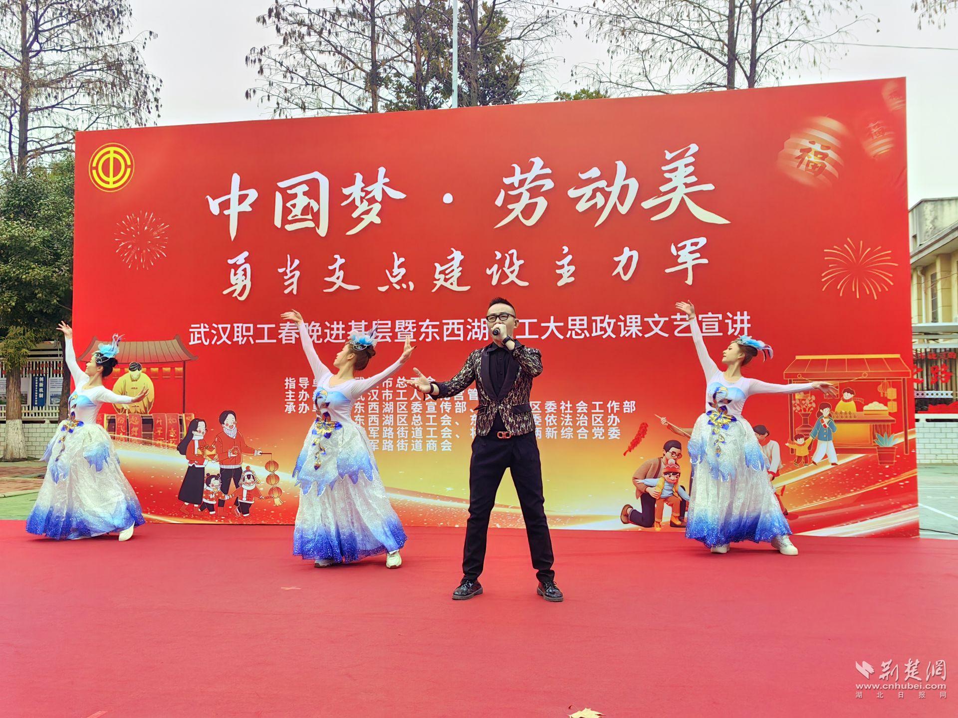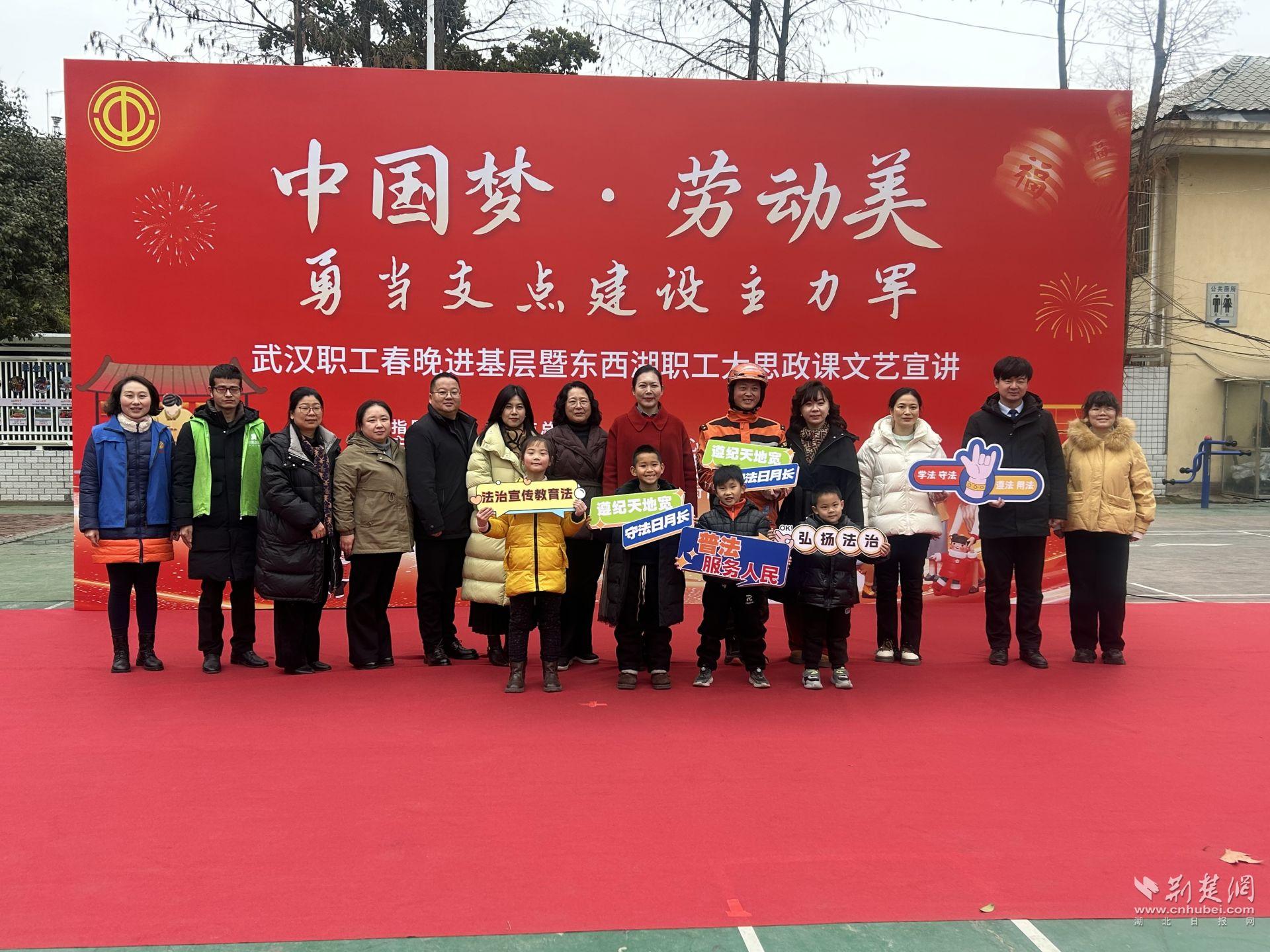 荆楚网(湖北日报网)讯(通讯员罗晶洁 石春康)1月27日下午,东西湖区将军路街道文化广场热闹非凡,“中国梦·劳动美 勇当支点建设主力军”武汉职工春晚进基层暨东西湖职工大思政课文艺宣讲活动热闹举行,以“法治暖新春 平安伴团圆”为主题的东西湖普法集市活动同步火热开展,为辖区居民们送去法治温暖与惠民服务。