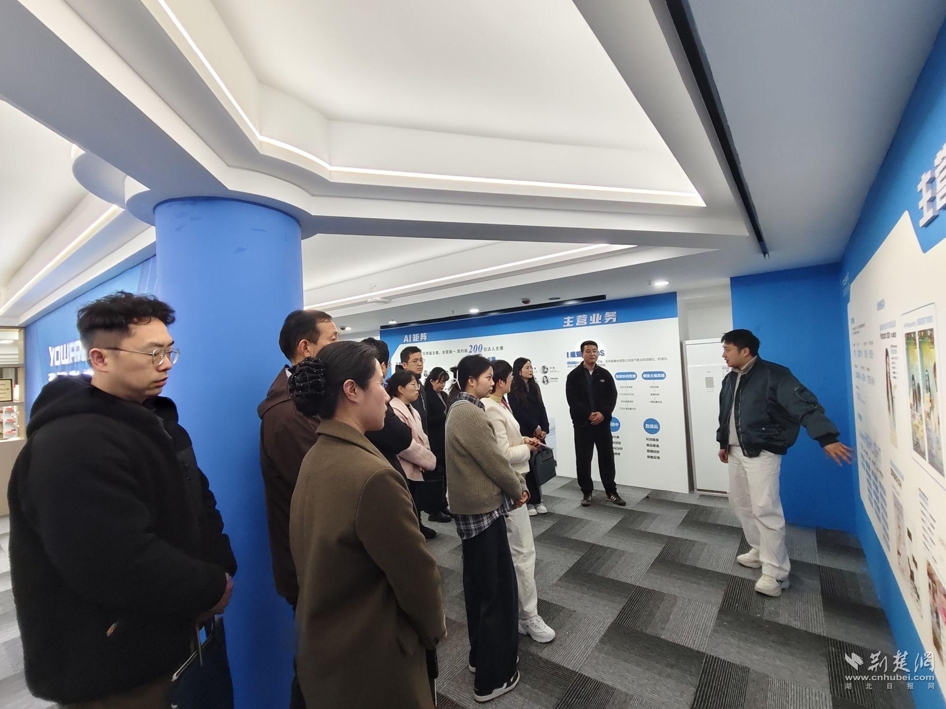 活动首站走进遥望科技武汉AI电商孵化中心。中心业务负责人详细介绍了企业发展概况、核心业务、产品体系、主播矩阵、优质直播案例及市场化运营模式,并陪同调研人员实地参观直播选品中心。随后,双方召开座谈交流会,围绕提升普法新媒体传播影响力、深化政企合作等主题开展深入交流。企业方结合行业实践提出多项建设性意见与务实建议,为我区推进网络普法、优化新媒体传播提供了有益参考。