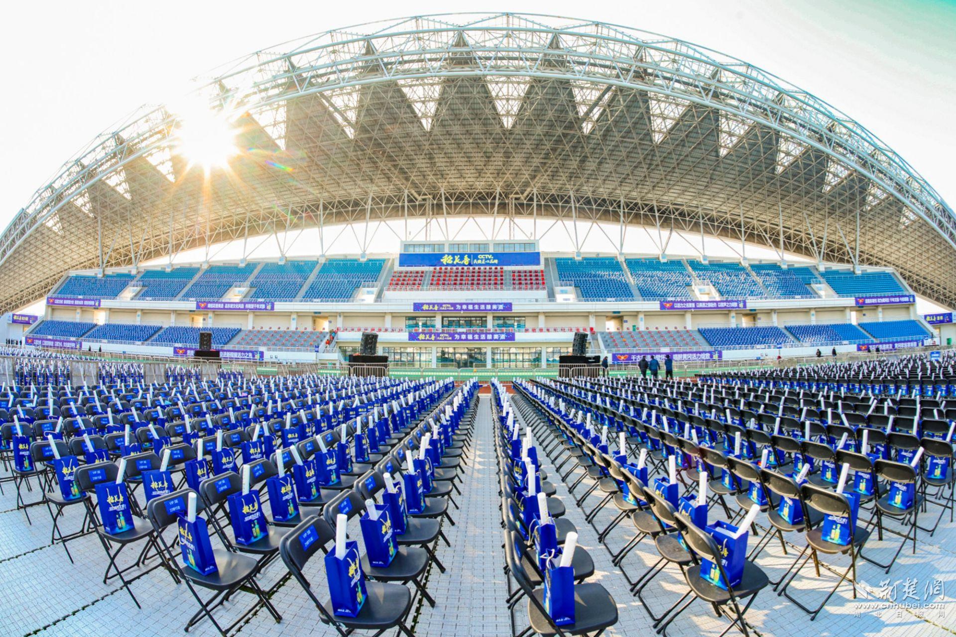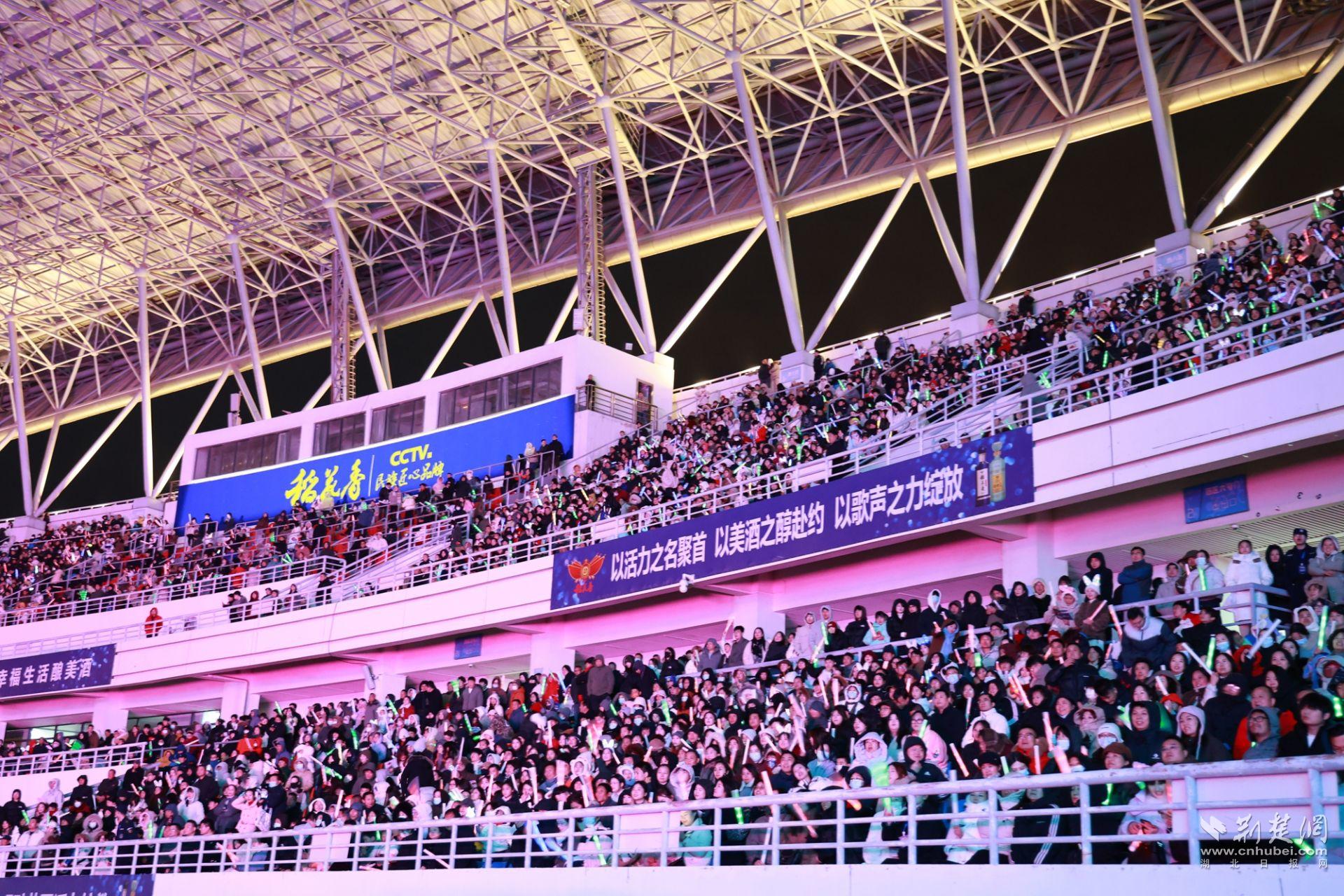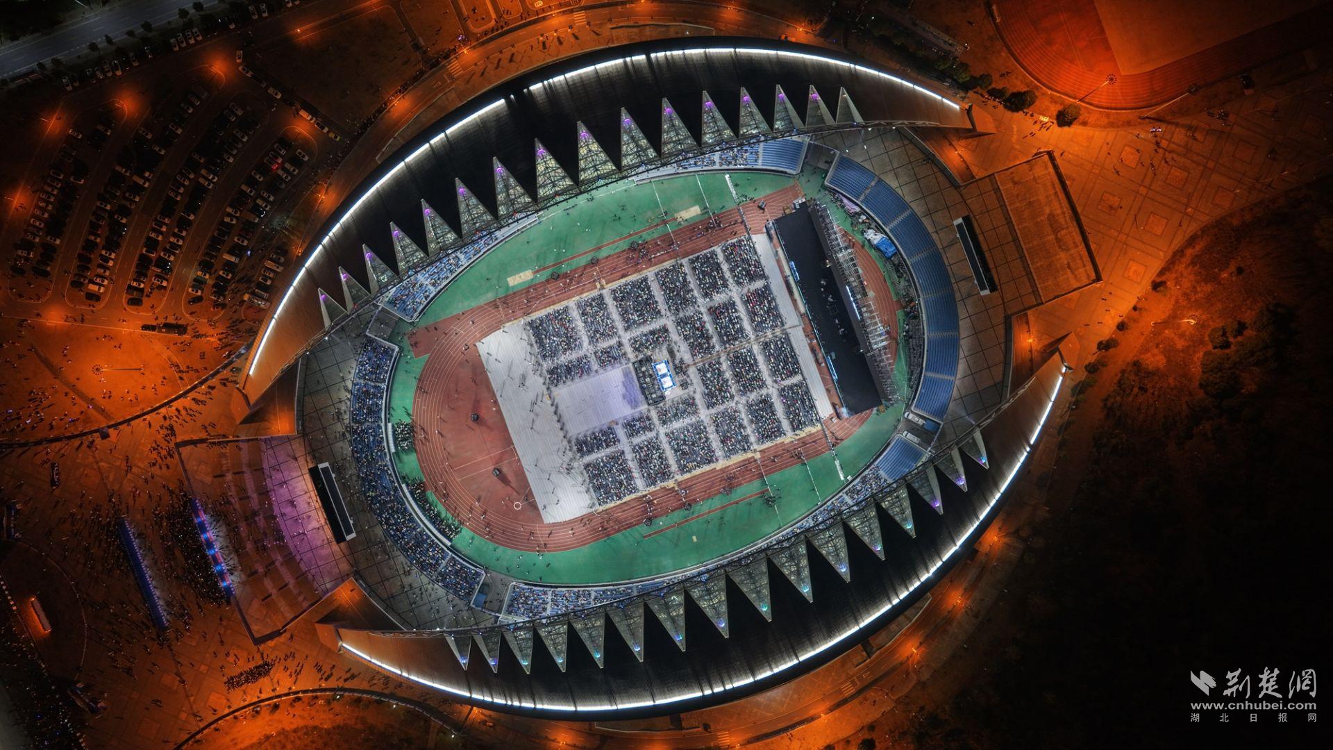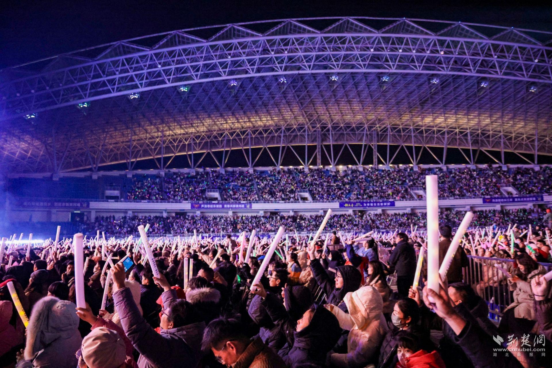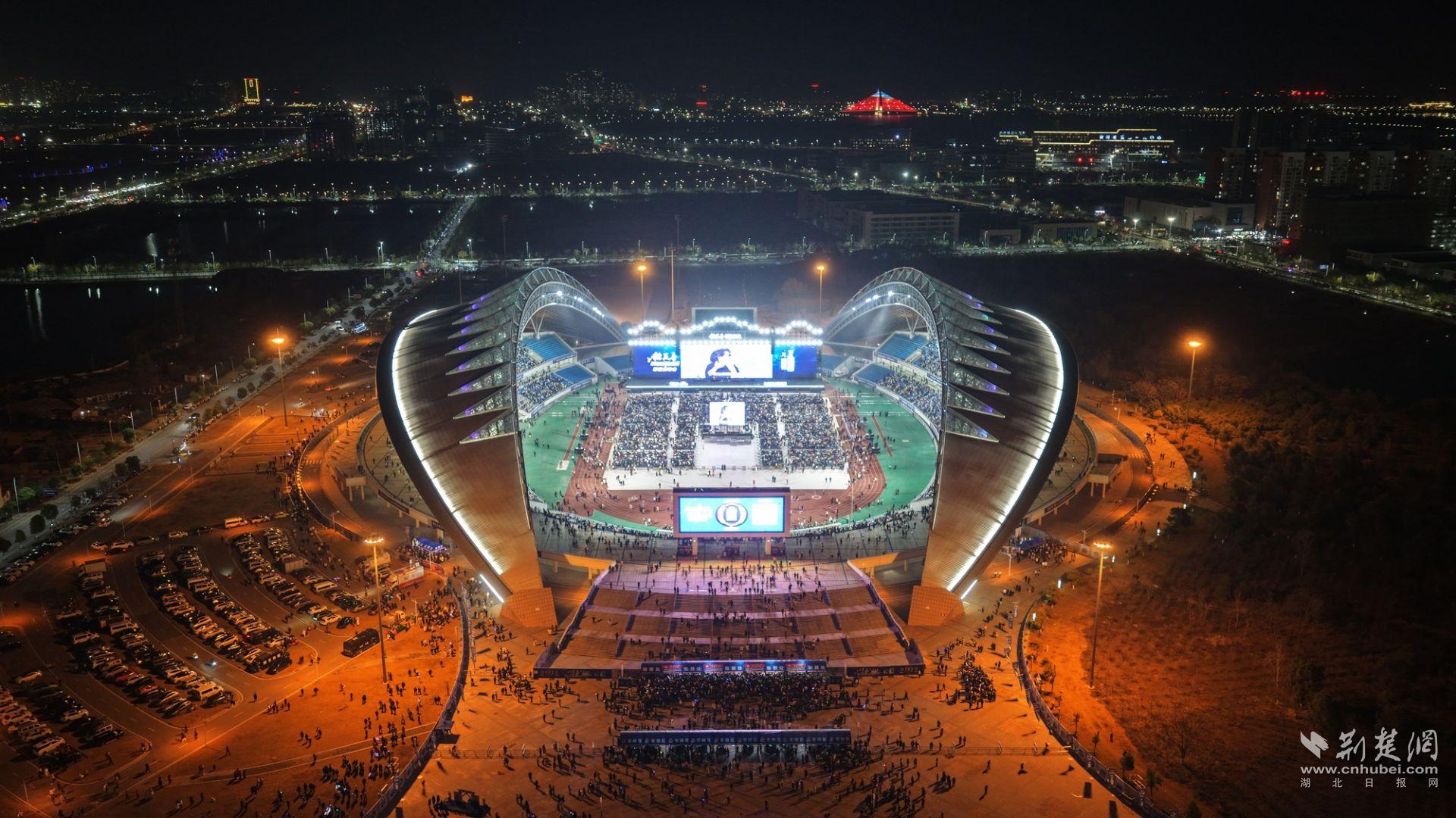 夜幕轻垂,华灯如昼,黄冈市体育中心体育场人潮如织、光影交错、声浪叠涌。