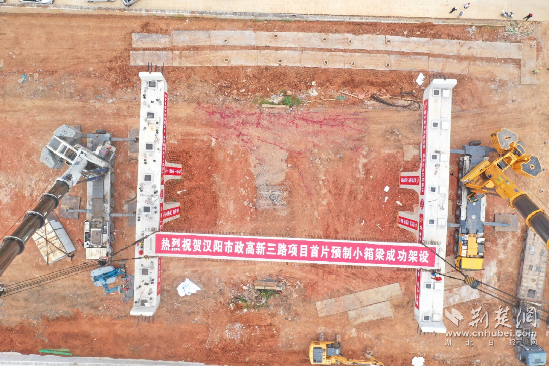 首片小箱梁吊装。2023年7月16日,主线桥首片小箱梁吊装就位,桥梁架设取得阶段性进展。