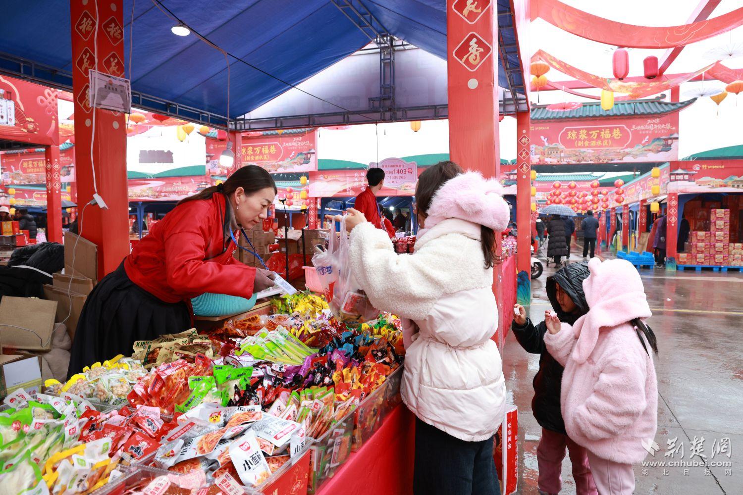 除了酒水展区,其他街巷同样购销两旺。在“瑶池果蔬巷”,来自全国各地的精品水果色泽诱人,智利车厘子、泰国榴莲、新疆香梨等应有尽有;“千珍御膳巷”各类精品粮油、南北干货、调味香料等商品丰富齐全,吸引众多消费者驻足选购;“上元美食巷”飘来阵阵香气,萝卜饺子、炕土豆、烤苕皮等宜昌特色小吃现做现卖,令人垂涎欲滴。